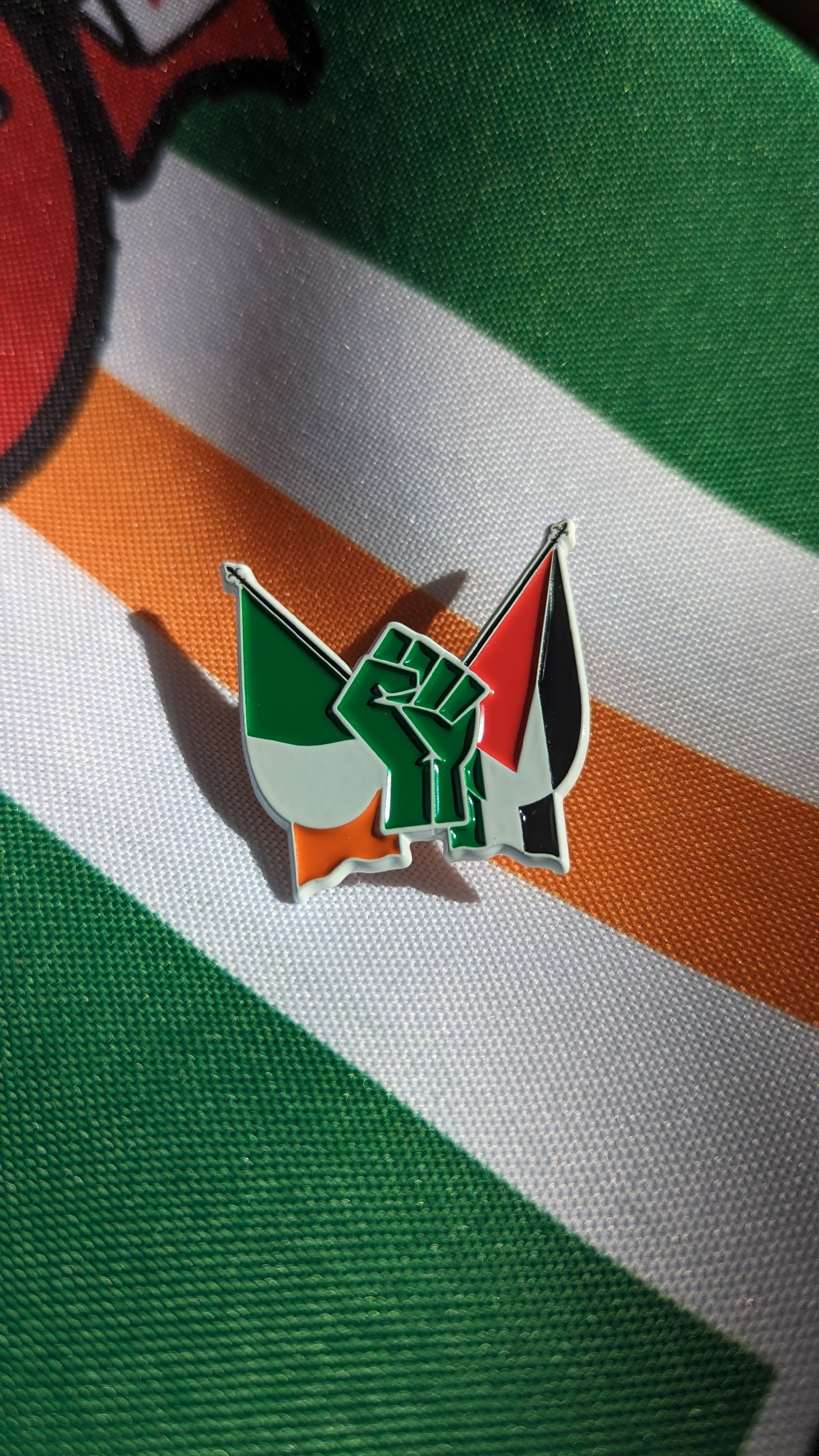 Badge has both the Ireland flag and Palestine flag with a fist of resistance in the middle.